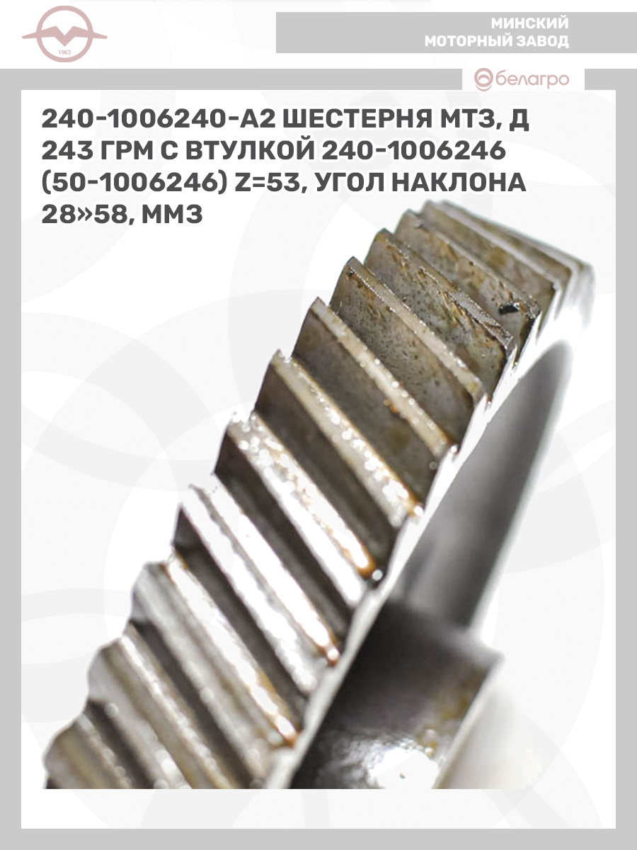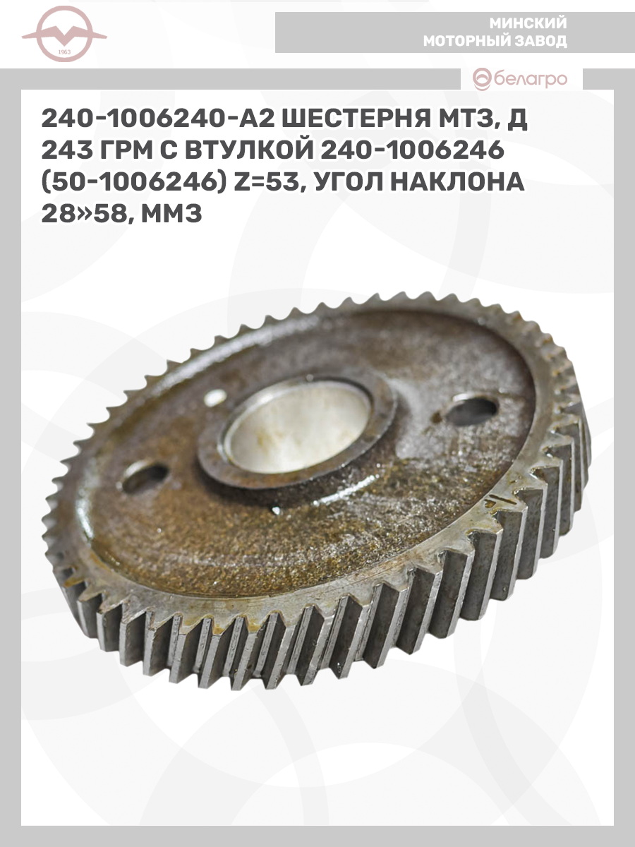 -240-1006240-А2 Шестерня МТЗ, Д243 ГРМ с втулкой 240-1006246 (50-1006246), z=53, угол наклона 28"58, ММЗЗапчасти к тракторам Беларус (МТЗ)ВкладышиГидроходоуменьшители и запчасти к нимЗапчасти к автомобилямГильзы цилиндровЗапчасти к спецтехнике АМКОДОРДвигателиЗапчасти к коммунальной спецтехникеДвигатели, запчасти к нимРасходники и техжидкостиХодовая часть и колёсаСистемы и агрегатыКоленвалыПоршневые кольцаПоршневые пальцыПоршнекомплектыПоршниПусковые двигатели и запчасти к нимТурбокомпрессорыЗапчасти к тракторам ХТЗ (Т-150)