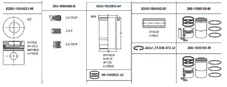 260-1000105-М Поршнекомплект МТЗ, МАЗ, Д-260 (ЕВРО-2) палец 42мм (гильза, поршень, кольца), РФ