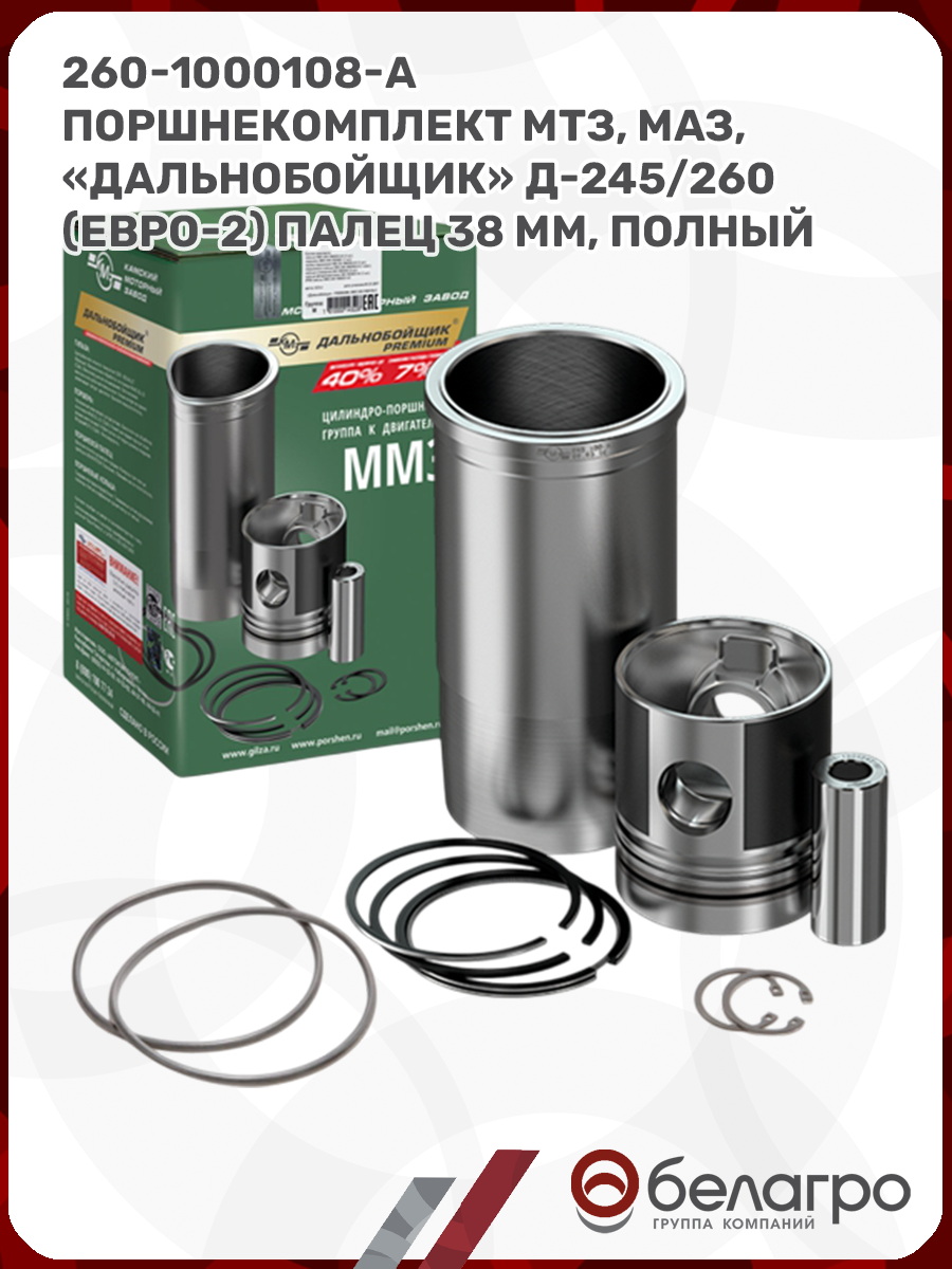 -260-1000108-А Поршнекомплект Мтз, Маз, "Дальнобойщик" Д-245/260 (Евро-2) палец 38 мм, полный комплектЗапчасти к тракторам Беларус (МТЗ)ВкладышиГидроходоуменьшители и запчасти к нимЗапчасти к автомобилямГильзы цилиндровЗапчасти к спецтехнике АМКОДОРДвигателиЗапчасти к коммунальной спецтехникеДвигатели, запчасти к нимРасходники и техжидкостиХодовая часть и колёсаСистемы и агрегатыКоленвалыПоршневые кольцаПоршневые пальцыПоршнекомплектыПоршниПусковые двигатели и запчасти к нимТурбокомпрессорыЗапчасти к тракторам ХТЗ (Т-150)