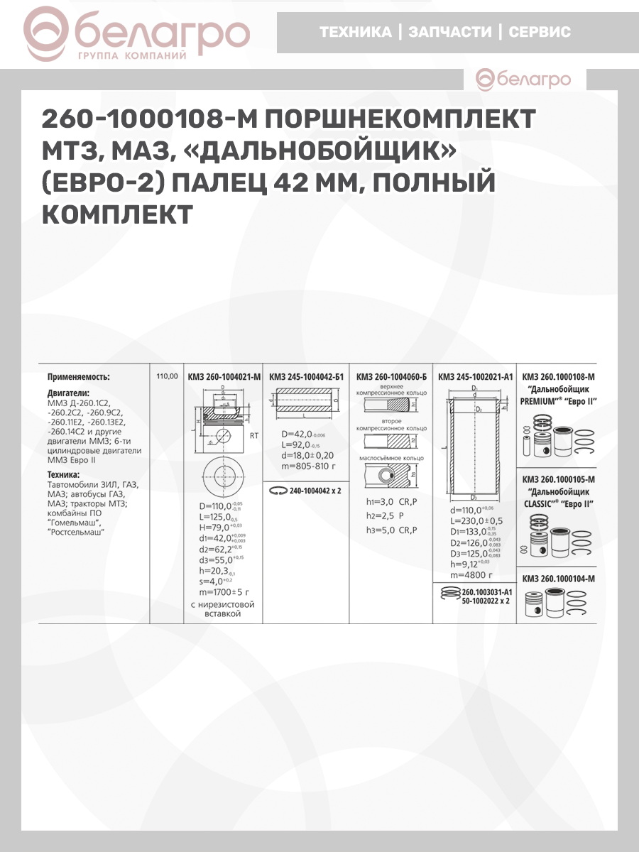 -260-1000108-М Поршнекомплект Мтз, Маз, "Дальнобойщик" (Евро-2) палец 42 мм, полный комплектЗапчасти к тракторам Беларус (МТЗ)ВкладышиГидроходоуменьшители и запчасти к нимЗапчасти к автомобилямГильзы цилиндровЗапчасти к спецтехнике АМКОДОРДвигателиЗапчасти к коммунальной спецтехникеДвигатели, запчасти к нимРасходники и техжидкостиХодовая часть и колёсаСистемы и агрегатыКоленвалыПоршневые кольцаПоршневые пальцыПоршнекомплектыПоршниПусковые двигатели и запчасти к нимТурбокомпрессорыЗапчасти к тракторам ХТЗ (Т-150)
