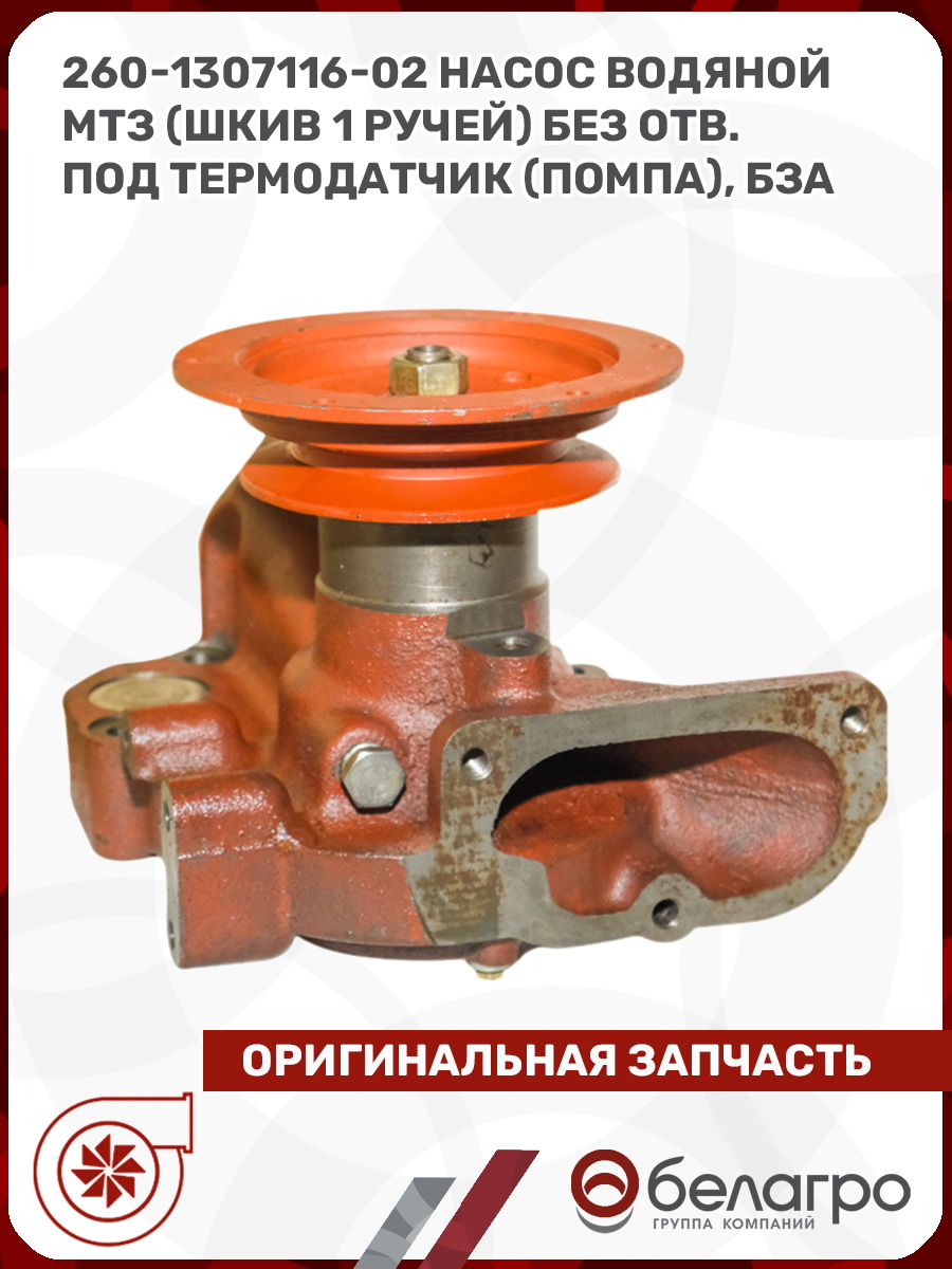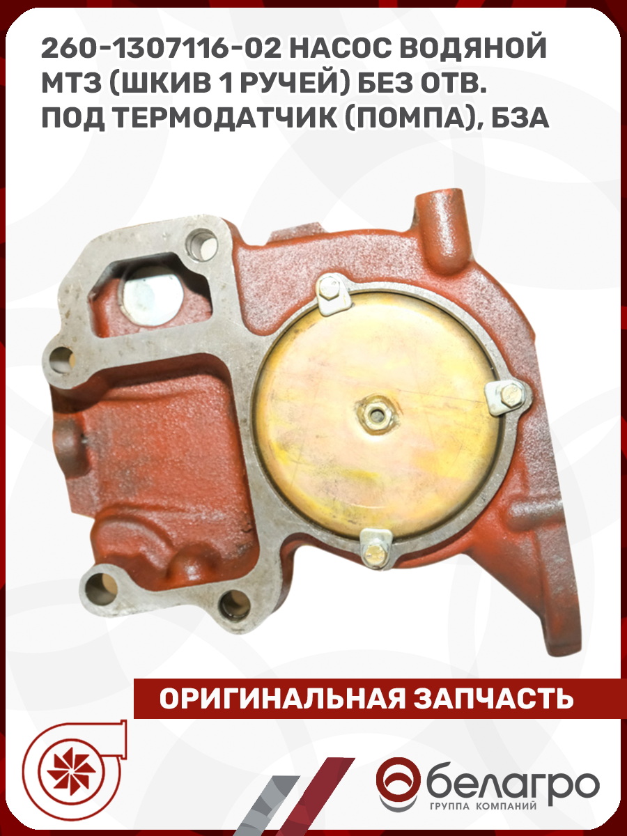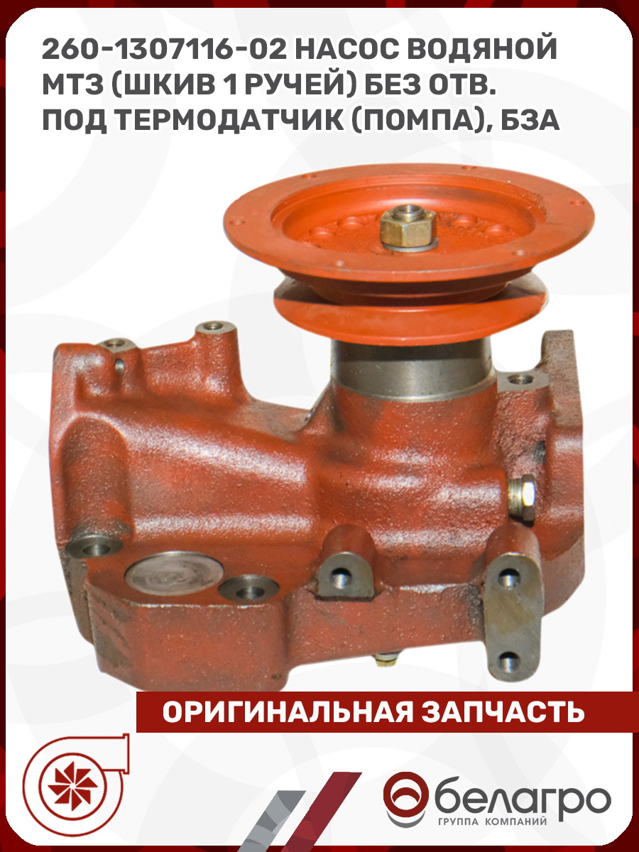 -260-1307116-02 Насос водяной МТЗ (шкив 1 ручей) без отв. под термодатчик (помпа), БЗАЗапчасти к тракторам Беларус (МТЗ)ВкладышиГидроходоуменьшители и запчасти к нимЗапчасти к автомобилямГильзы цилиндровЗапчасти к спецтехнике АМКОДОРДвигателиЗапчасти к коммунальной спецтехникеДвигатели, запчасти к нимРасходники и техжидкостиХодовая часть и колёсаСистемы и агрегатыКоленвалыПоршневые кольцаПоршневые пальцыПоршнекомплектыПоршниПусковые двигатели и запчасти к нимТурбокомпрессорыЗапчасти к тракторам ХТЗ (Т-150)