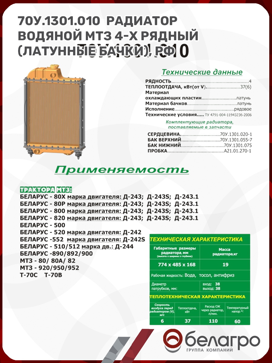 -70У.1301.010 Радиатор водяной МТЗ 4-х рядный (латунные бачки), РФВыключатели, переключателиГенераторы и комплектующиеГидроарматураГидроарматура (муфты, переходники, штуцера)ГидрораспределительГидроцилиндрыДатчики, указатели, приборыемкость 120-140 А/чемкость 190-225 А/чемкость 45-62 А/чемкость 66-77 А/чемкость 90-100 А/чЗапчасти к тракторам Беларус (МТЗ)Клеммы, проводаКомплекты переоборудованияНасосыПатрубкиПлунжерные парыПрочееПрочиеРаспределитель гурРаспределитель подъема кузоваРегуляторыРеле и регуляторыРемкомплектыСтартеры и комплектующиеТНВД, ТННДТрубопроводыФары, фонари и комплектующиеФорсунки, распылители