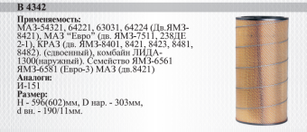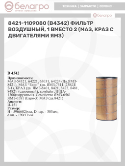 8421-1109080 (В4342) Фильтр воздушный (1 вместо 2) (МАЗ,КРАЗ с двиг.ЯМЗ)