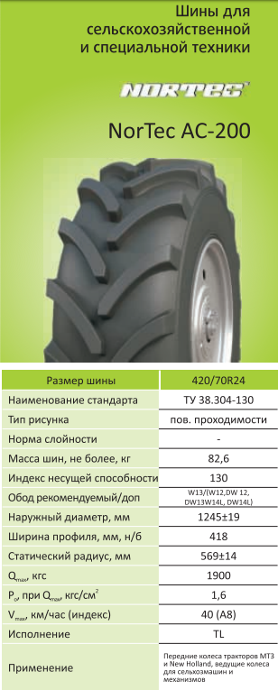 Модель АС 200 Типоразмер 420/70R24 Посадочный диаметр 24 Рисунок протектора Повышенной проходимости (ёлочка) Максимальная скорость, км/ч 50 Максимальная нагрузка, кг 1264 -