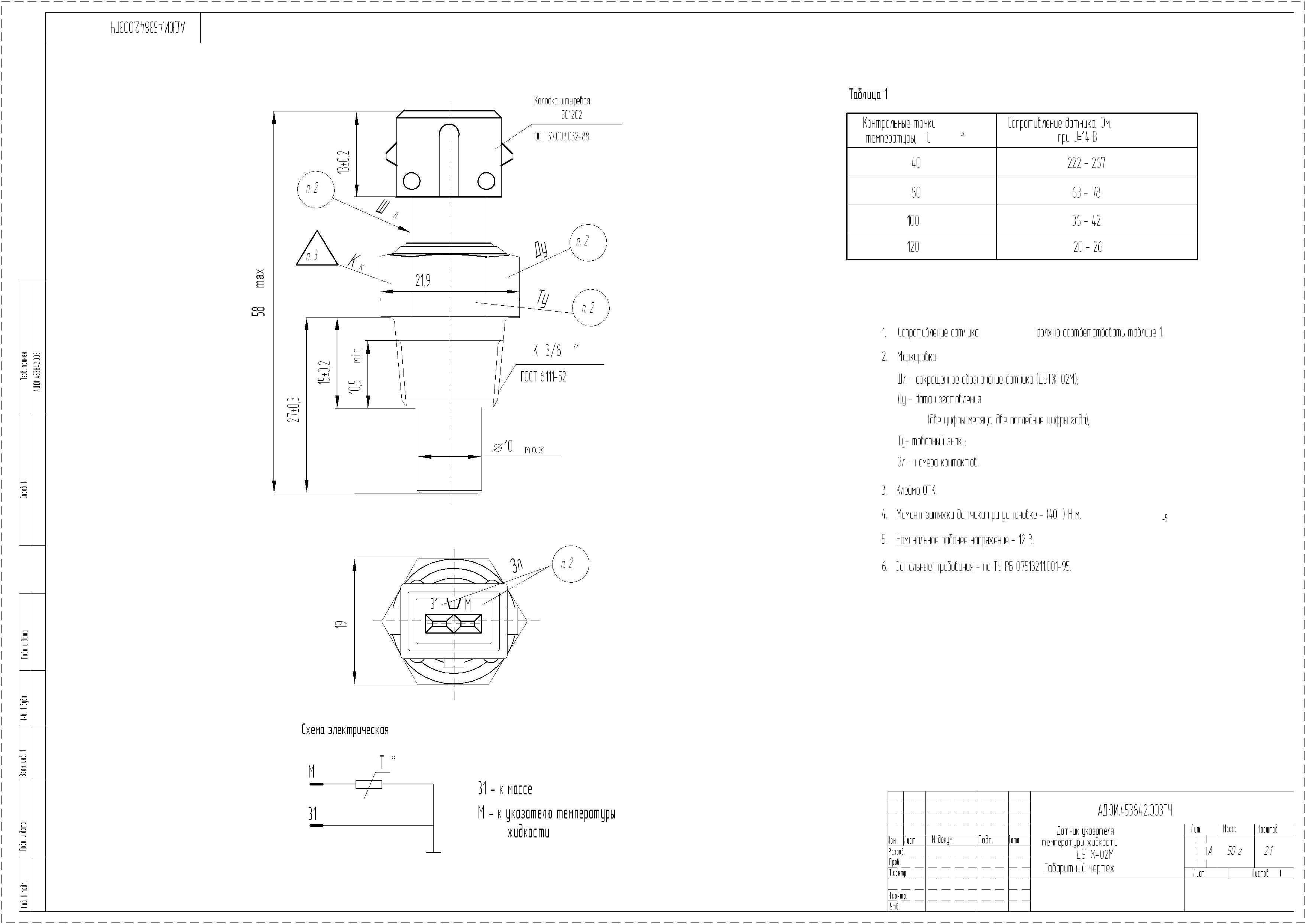ДУТЖ-02М Датчик МТЗ, МАЗ указателя температуры (штыревая колодка), Беларусь