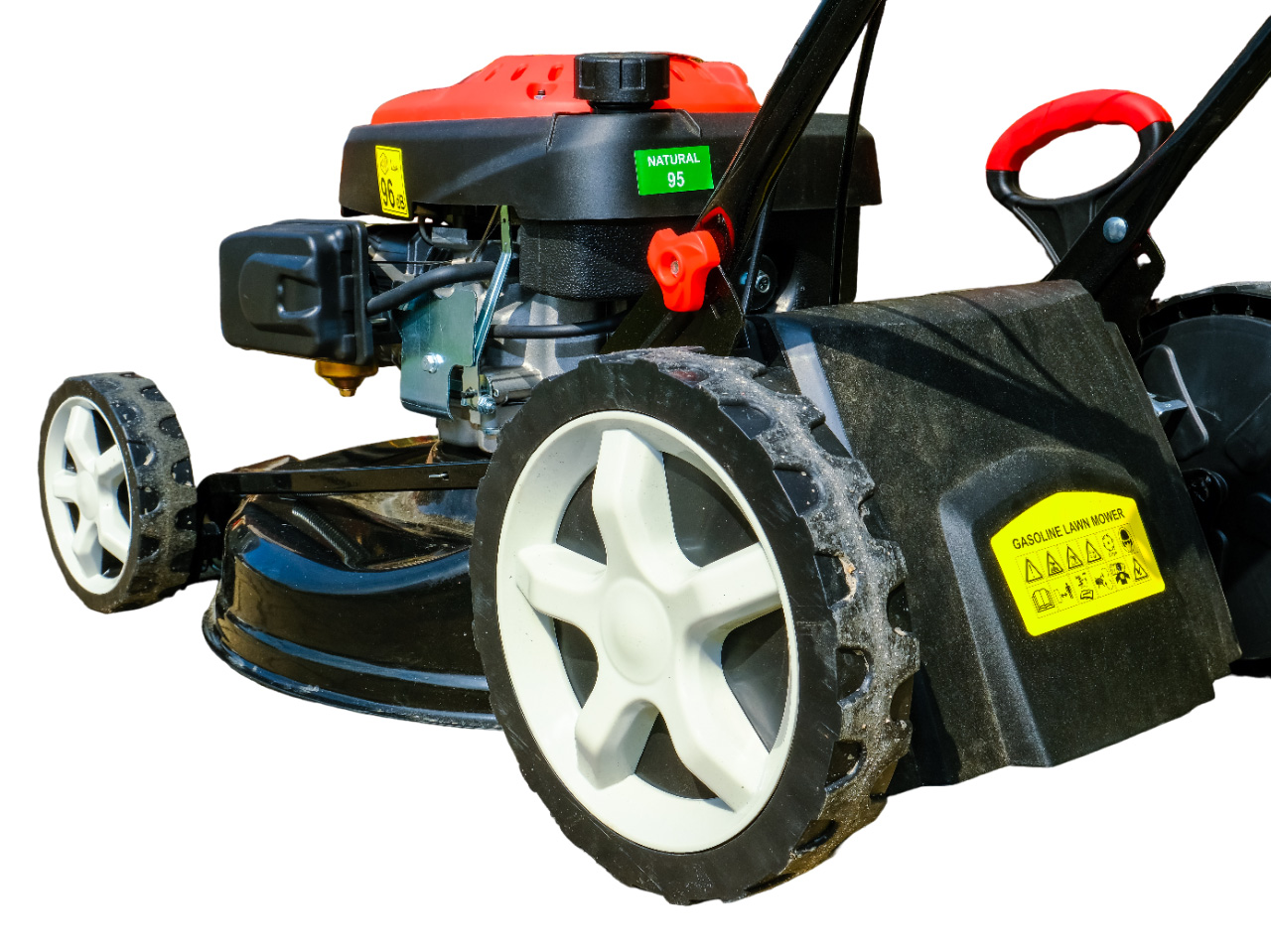 - Разный диаметр передних и задних колес сообщает косилке высокую маневренность и малый радиус поворота, что особенно важно на участках с переменным рельефом и зелеными насаждениями