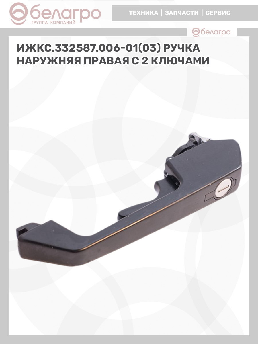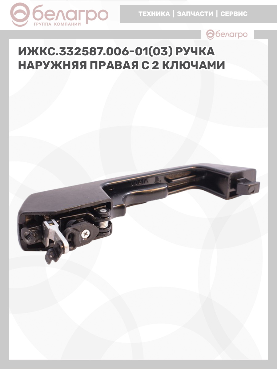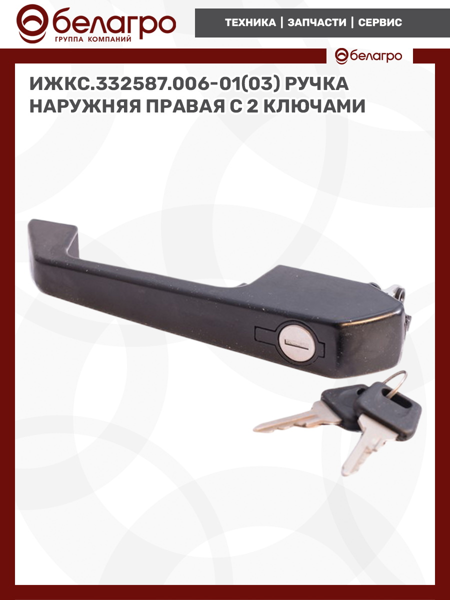 --ИЖКС.332587.006-01(03) Ручка наружняя правая с 2 ключамиЗапчасти к тракторам Беларус (МТЗ)ВкладышиГидроходоуменьшители и запчасти к нимЗапчасти к автомобилямГильзы цилиндровЗапчасти к спецтехнике АМКОДОРДвигателиЗапчасти к коммунальной спецтехникеДвигатели, запчасти к нимРасходники и техжидкостиХодовая часть и колёсаЗапчасти к двигателямСистемы и агрегатыКоленвалыПоршневые кольцаПоршневые пальцыПоршнекомплектыПоршниПусковые двигатели и запчасти к нимТурбокомпрессорыЗапчасти к тракторам ХТЗ (Т-150)