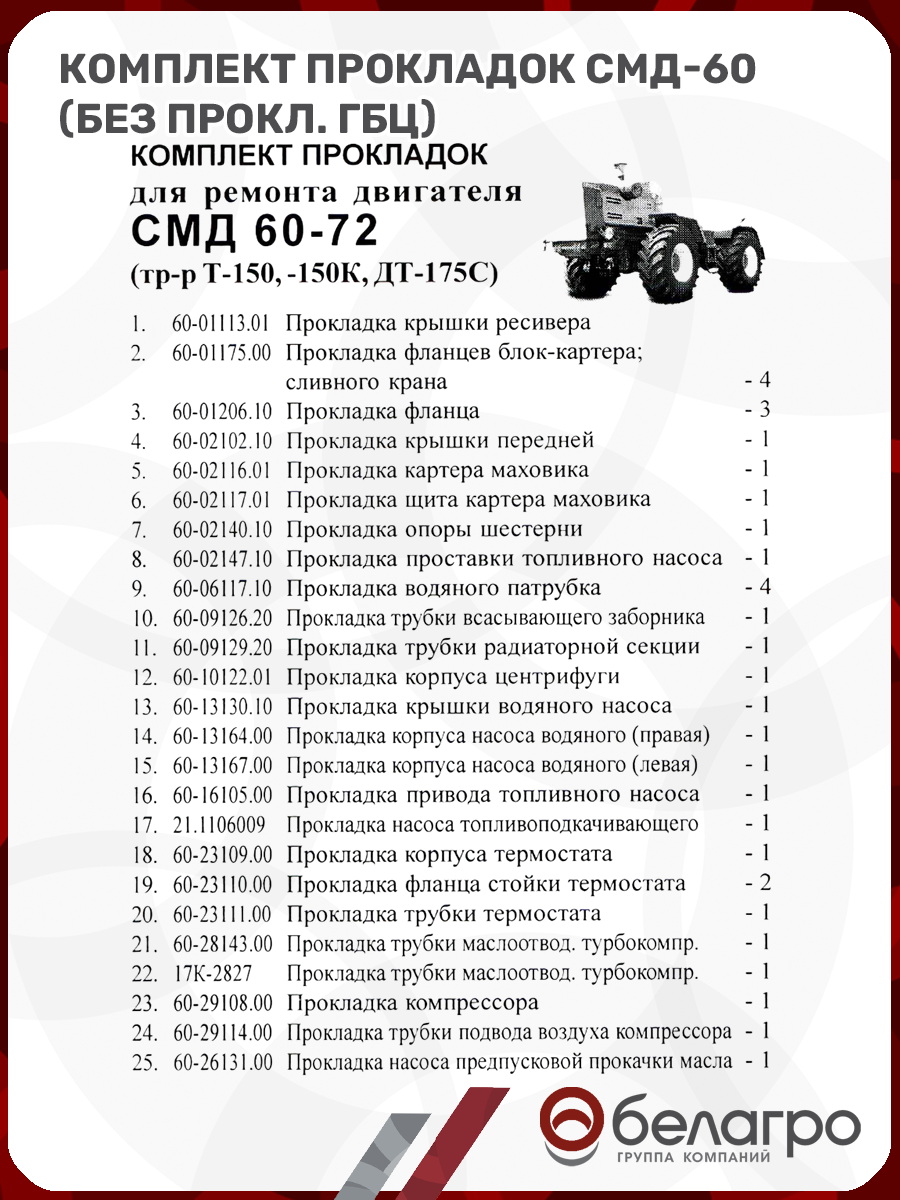 -Комплект прокладок СМД-60 (без прокл. ГБЦ)Запчасти к тракторам Беларус (МТЗ)ВкладышиГидроходоуменьшители и запчасти к нимЗапчасти к автомобилямГильзы цилиндровЗапчасти к спецтехнике АМКОДОРДвигателиЗапчасти к коммунальной спецтехникеДвигатели, запчасти к нимРасходники и техжидкостиЗапчасти к двигателямХодовая часть и колёсаСистемы и агрегатыКоленвалыПоршневые кольцаПоршневые пальцыПоршнекомплектыПоршниТурбокомпрессорыЗапчасти к тракторам ХТЗ (Т-150)
