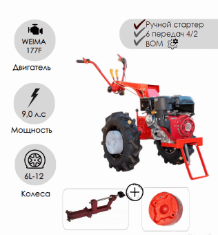 Удельный расход топлива, г/(кВт/ч) 0,395 Двигатель WEIMA 177F Номинальная мощность двигателя. кВт/л.сил 6,6/9,0 Тип топлива Бензин Объем топливного бака, л 6.5 Вал отбора мощности Да Понижающая передача Нет Дифференциал Да Трансмиссия МТЗ Аналоги навески МТЗ Система пуска двигателя Ручной стартер Частота вращения коленвала, об/мин 3600 Число передач 4/2 Скорость движения транспортная, км/ч 12 Агротехнический просвет, не менее, мм 295 Колея, мм 450-700 Тип коробки передач Механическая, ступенчатая, с постоянным зацеплением шестерен Размер колес, дюйм 6L-12 по ГОСТ 7463 (допускается замена на шины других марок Тип редуктора Шестеренчатый Тип муфты сцепления Многодисковая, постояннозамкнутая, работающая в масляной ванне с ручным управлением Высота, мм 1070 Гарантия, мес. Для Республики Беларусь -36 мес, для Российской Федерации-12 мес Страна-производитель РБ Импортер ООО "Белагро Бел", 220047, Республика Беларусь, г.Минск, ул.Илимская, 58, к.1 Длина, мм 1780 Ширина, мм 846 Вес, кг. 176 -
