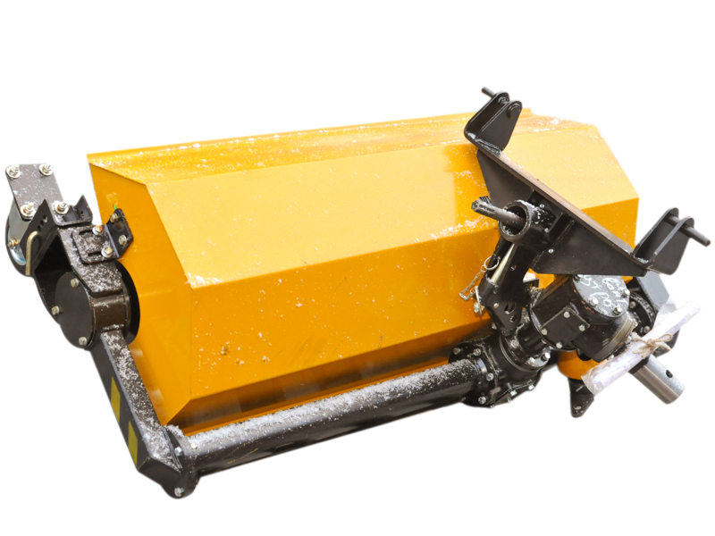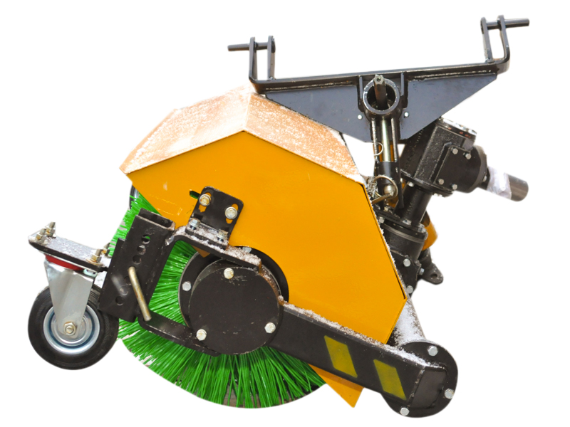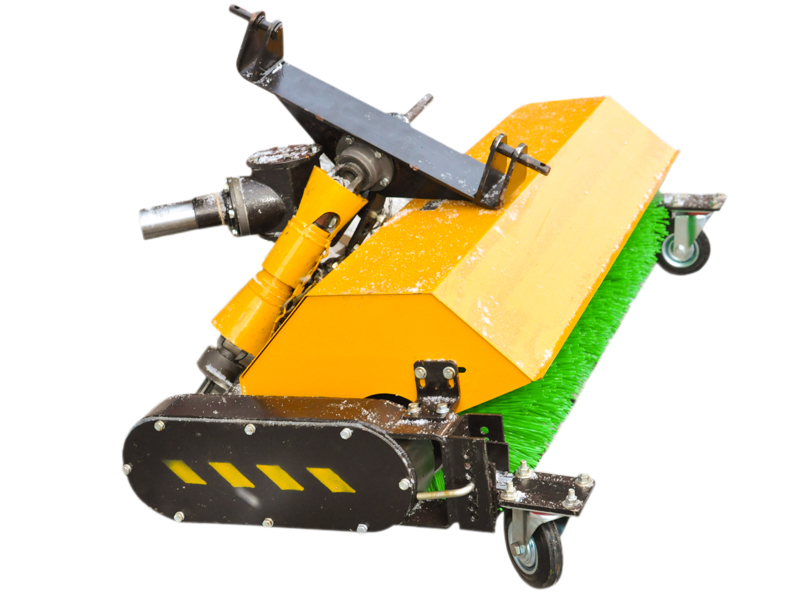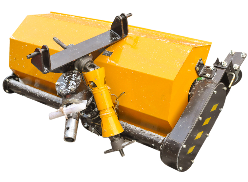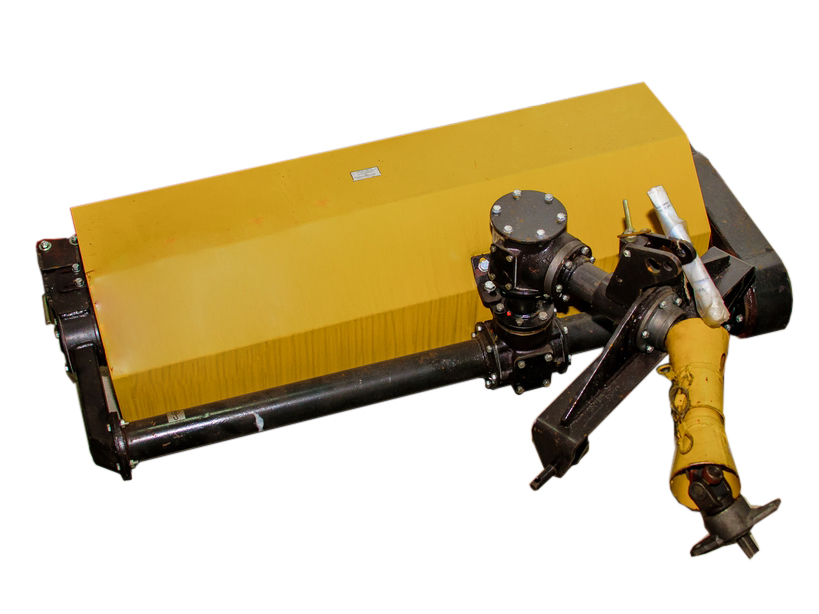 Щетка агрегатируется через карданный вал и кронштейн с валом отбора мощности (ВОМ) и рычагами навесного устройства мини-трактора.