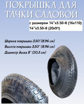 Шина (покрышка) предназначена для установки на колесо садовых и строительных тачек с размером 14''x3.50-8 (16х110),14''x3.50-8 (20х91)